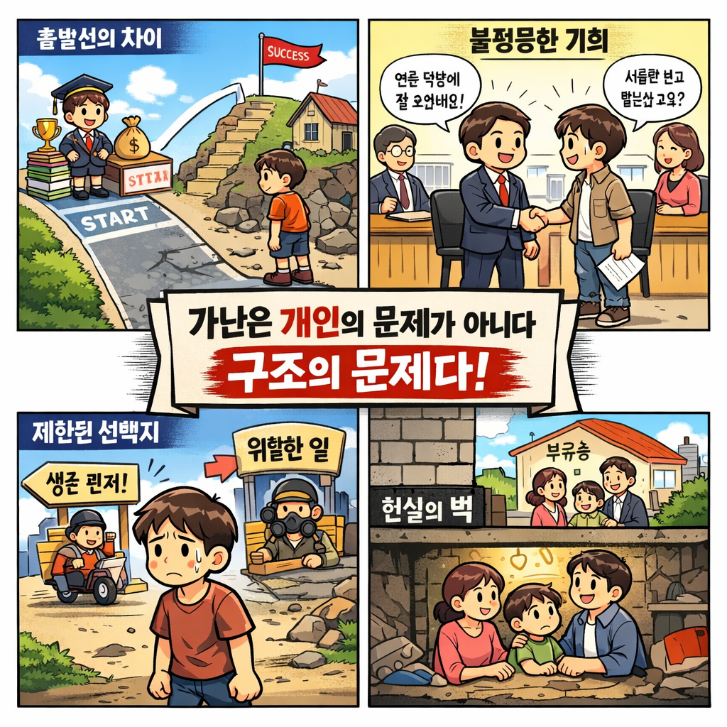 가난을 개인의 문제로만 바라보는 시선은 구조적인 문제를 가리게 만든다. 이는 사회적으로 매우 위험한 인식이다. 개인의 책임을 강조할수록 구조적인 개선은 뒤로 밀리게 되기 때문이다.